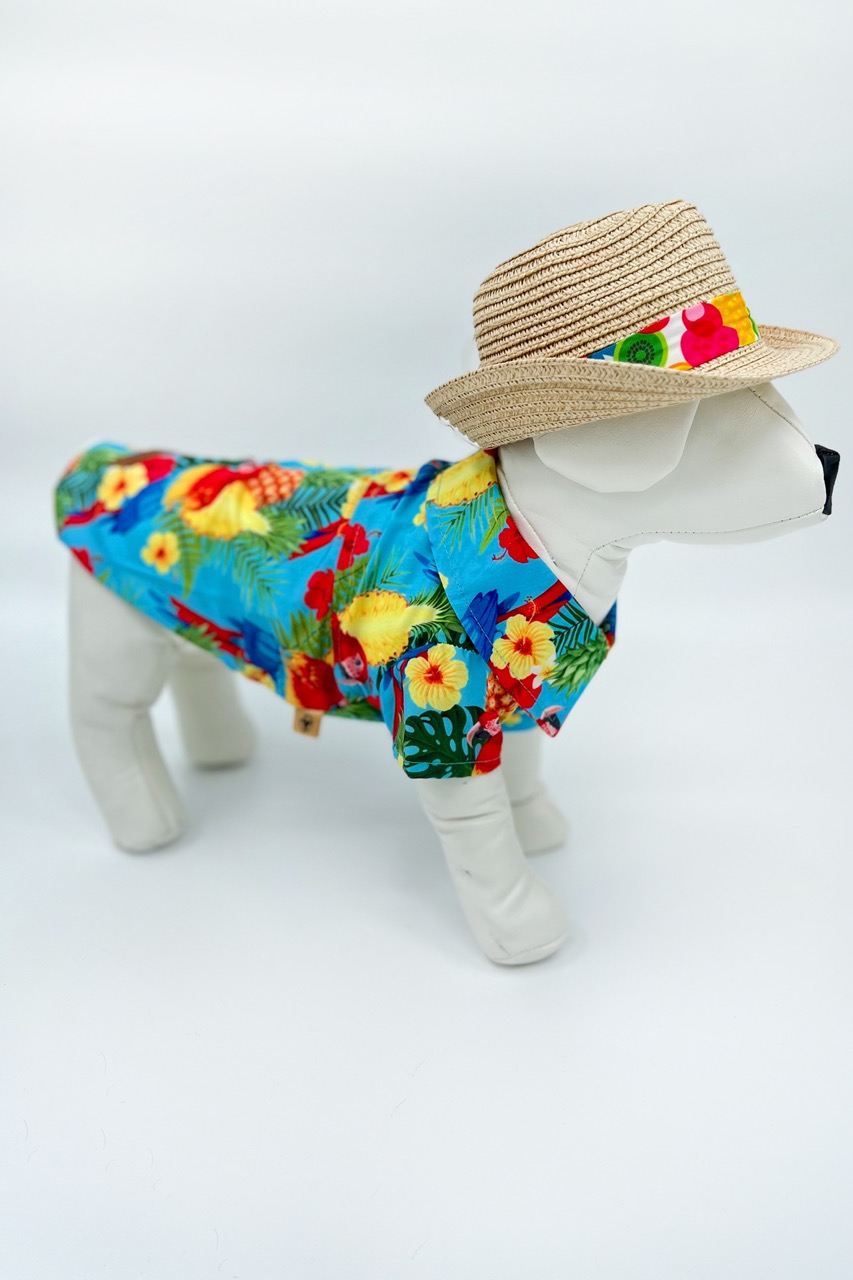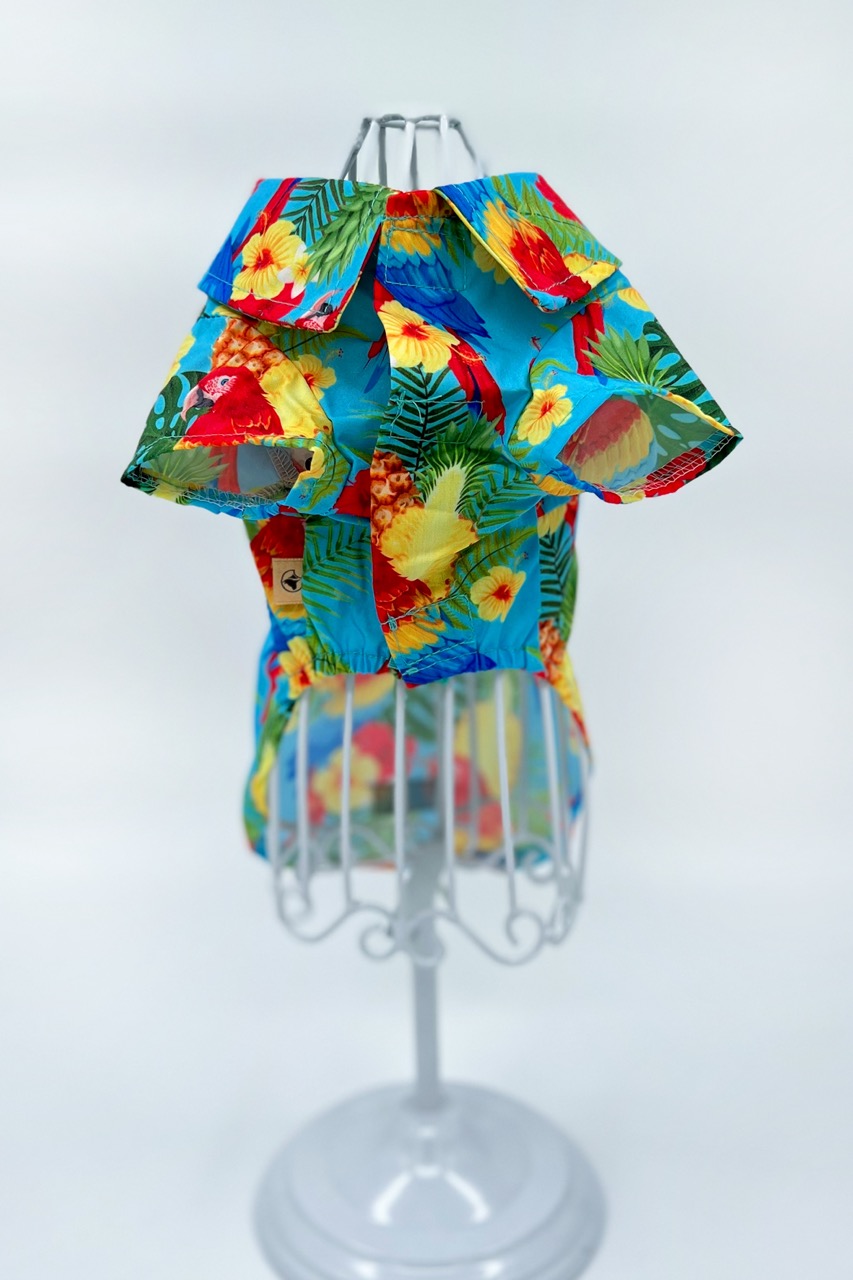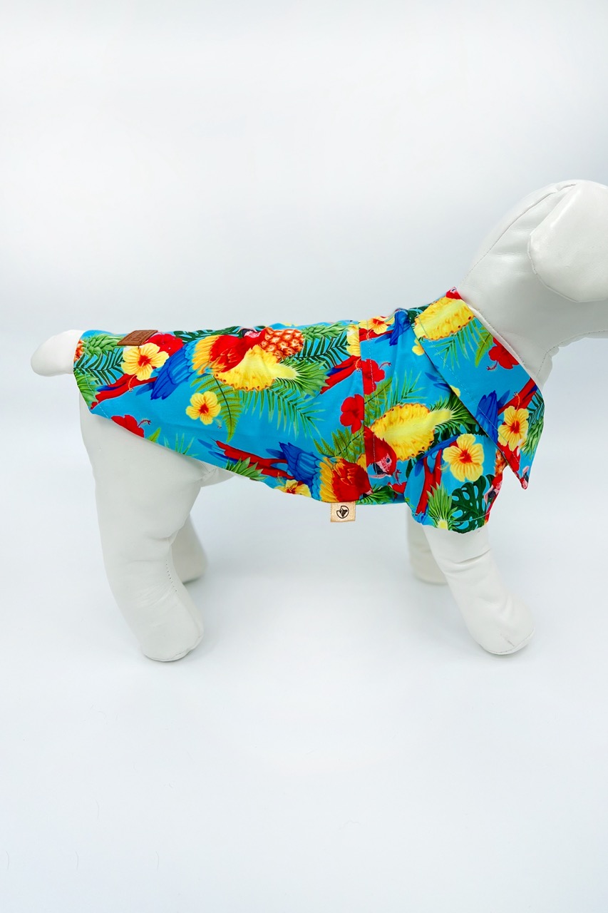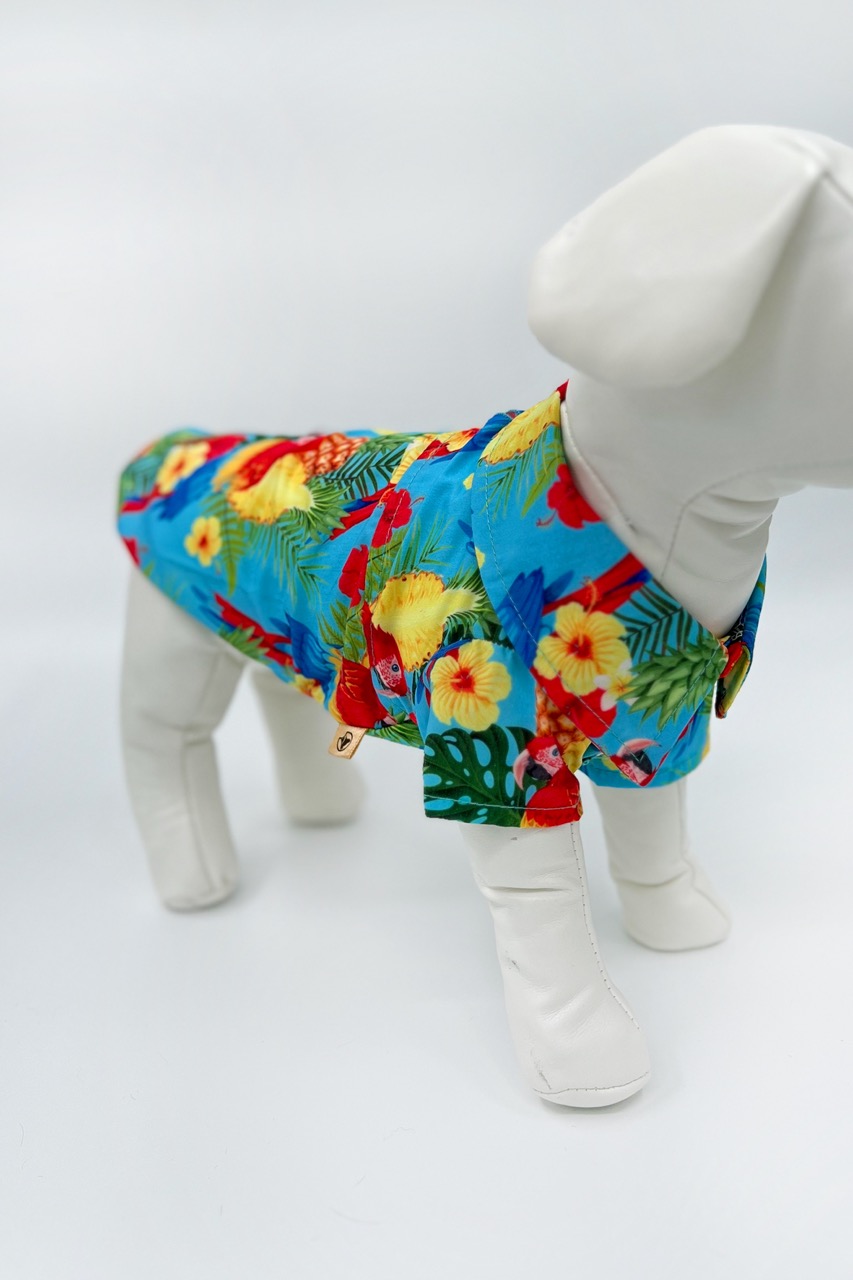 En färgglad skjorta till din fyrbenta vän! Tillverkad av lätt bomullstyg med tropiskt tryck perfekt för att visa upp en look som inte går obemärkt förbi under strandfester eller sommarpromenader! Stängningen är snabb och enkel med kardborreband, skjortan är även försedd med elastiska band för bakbenen för att säkerställa en perfekt passform på plagget.