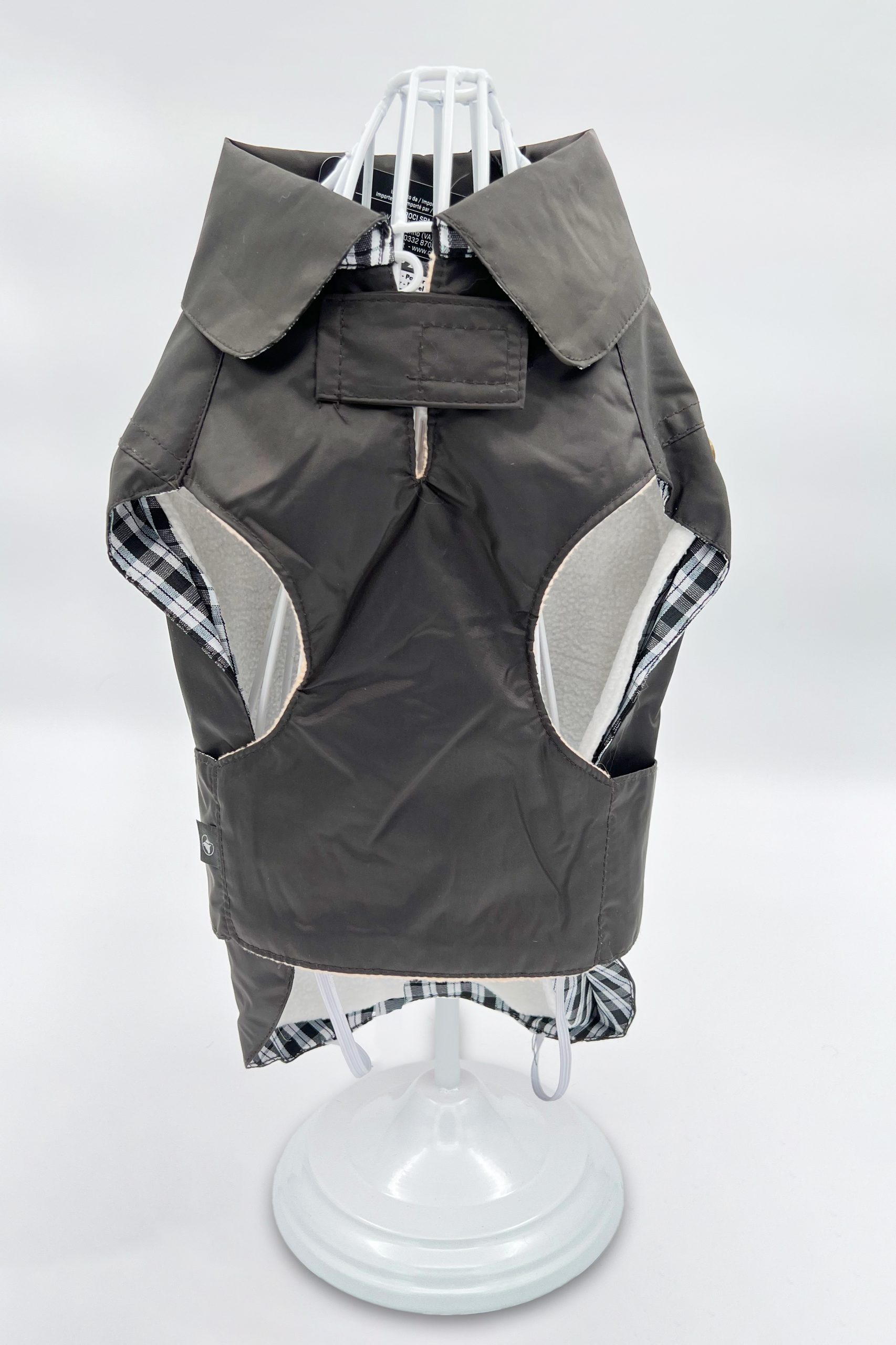 Det inre fleecefoderet är avtagbart. Kappan har ett hål på baksidan för att passera kopplet eller selefästet.