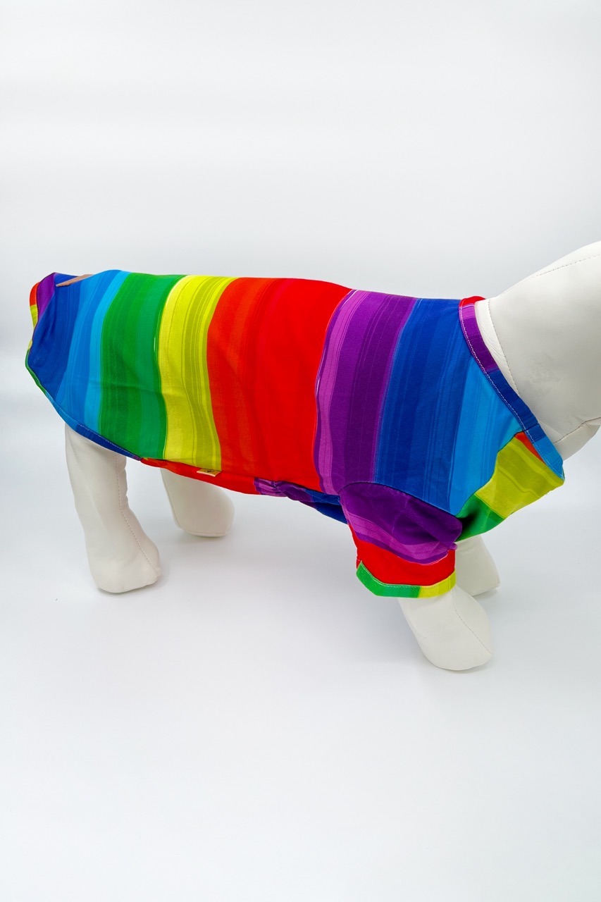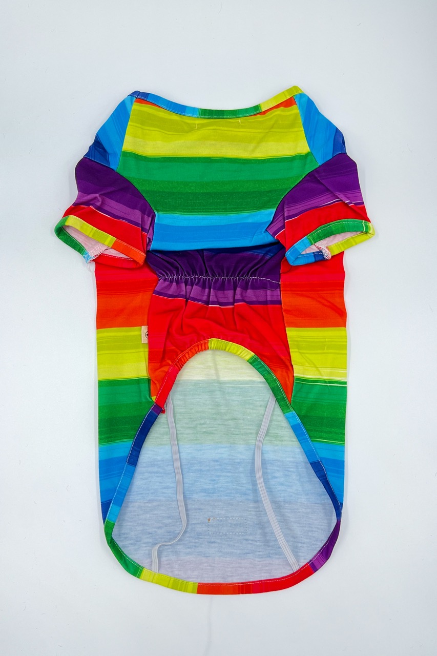 Rainbow T-Shirt for Dogs är en färgglad t-shirt för våra fyrbenta vänner med en regnbågsstruktur! Färglägg din sommar och ditt husdjur genom att visa upp en perfekt festlook på stranden eller för sommarpromenader.